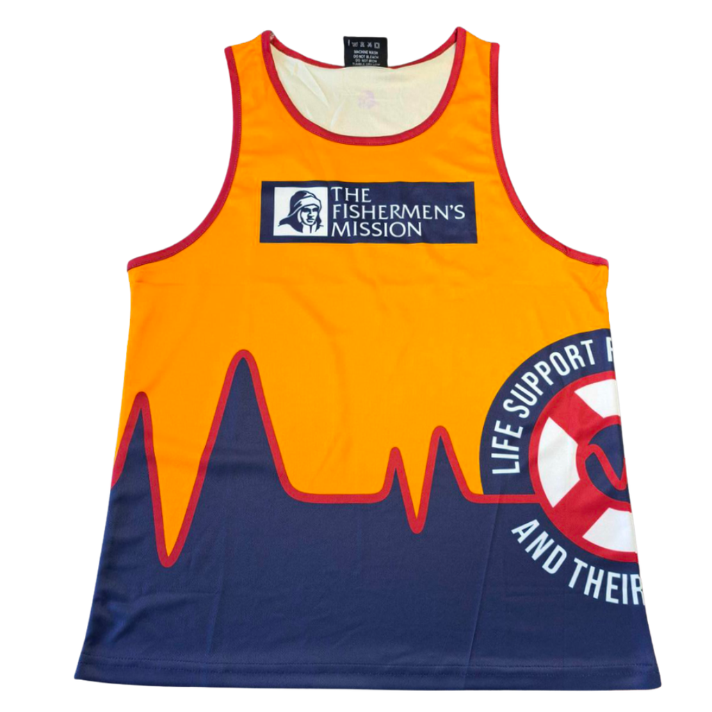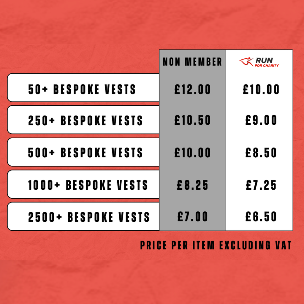 Custom branded charity running vests, male, female and unisex sizing 3XS - 4XL